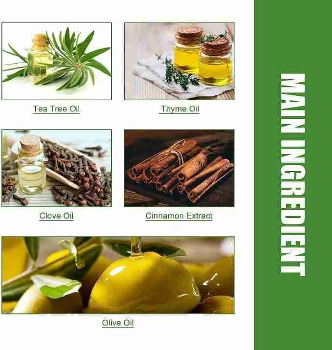Composition/Main Ingredients: Tea Tree Oil, Thyme Oil, Cinnamon Extract, Clove Oil & Olive Oil